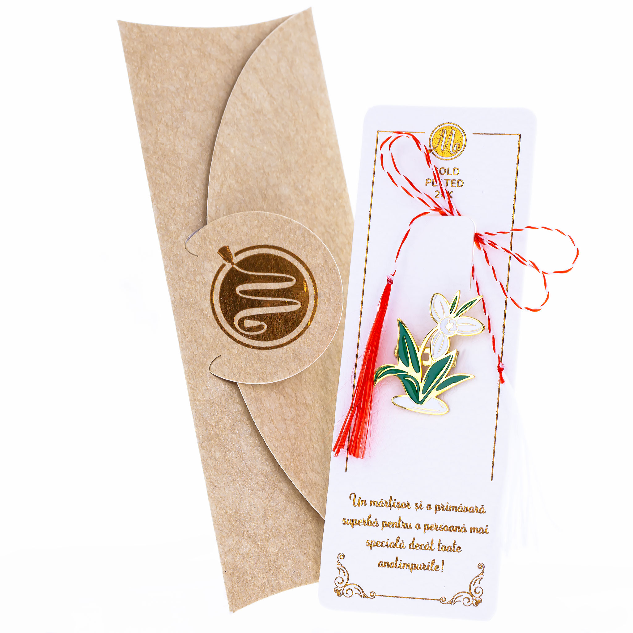- Broșă Mărțișor Iris Gold Plated Ghiocel Înflorit, șnur Marțișor alb-roșu, însoțită de suport pentru broșă și plic, pregătită cu grijă pentru a fi oferită ca un cadou special, simbol al tradiției.
