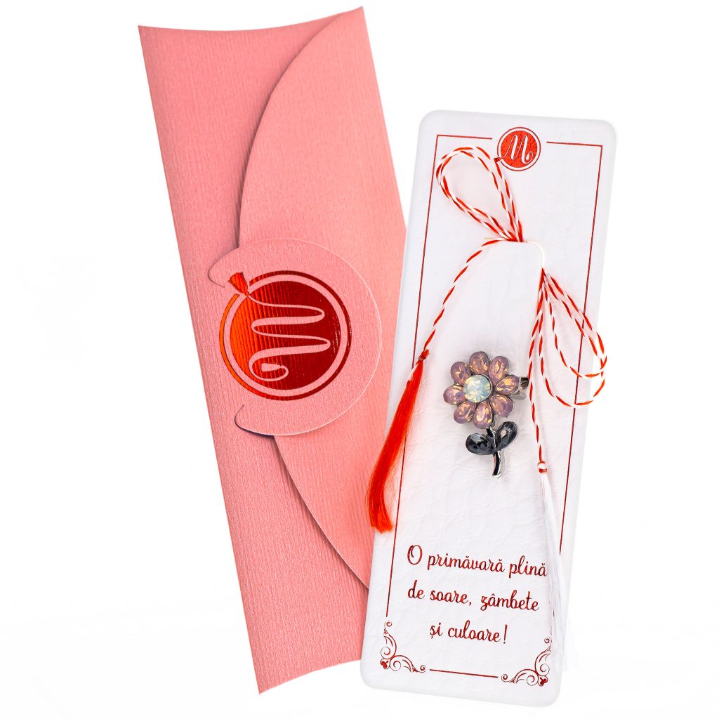 - Broșă Mărțișor Luna Floare Argintie cu Petale Roz, șnur Marțișor alb-roșu, însoțită de suport pentru broșă, plic roz, pregătită cu grijă pentru a fi oferită ca un cadou special, simbol al tradiției.