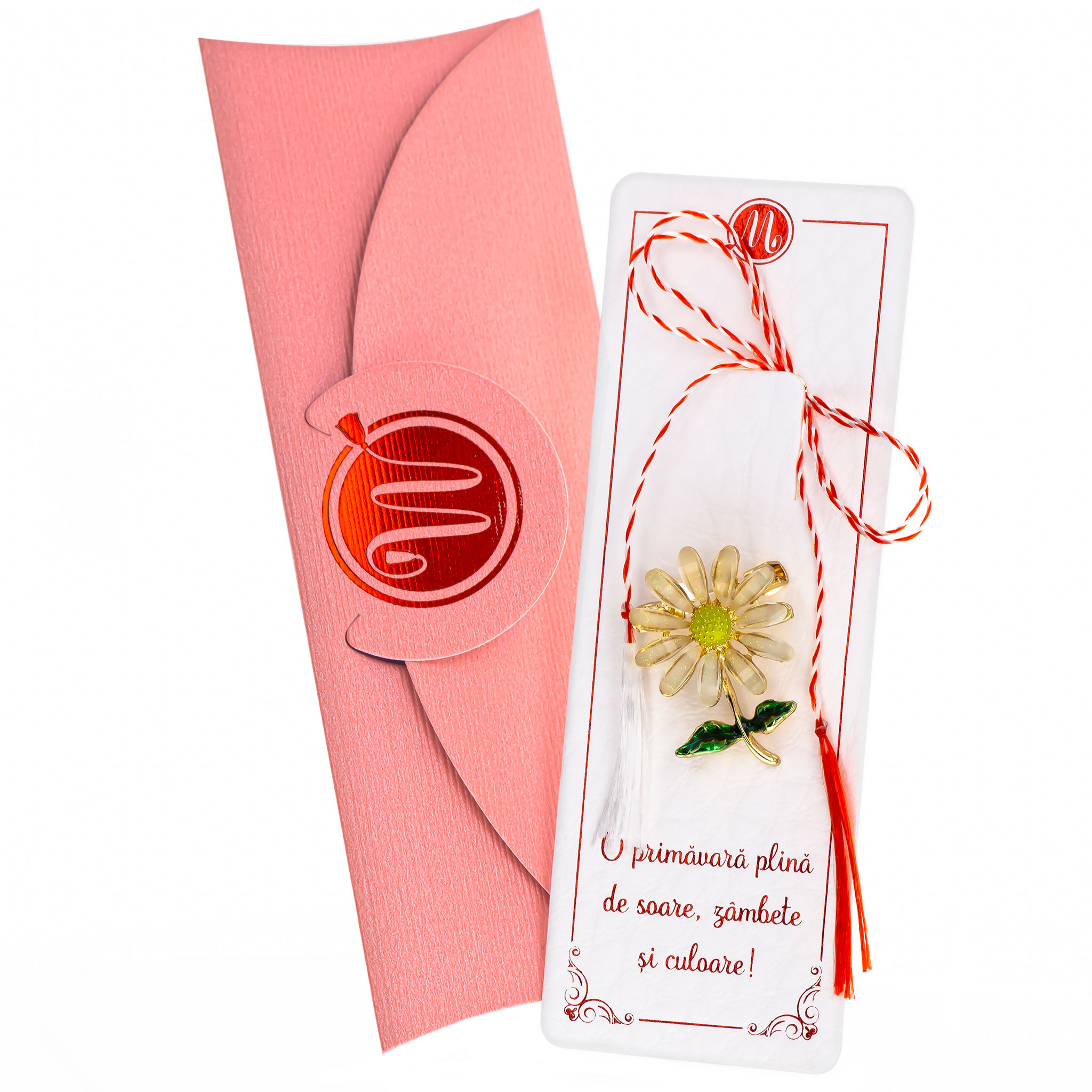 - Broșă Mărțișor Luna Floare Aurie cu Petale Albe, șnur Marțișor alb-roșu, însoțită de suport pentru broșă, plic roz, pregătită cu grijă pentru a fi oferită ca un cadou special, simbol al tradiției.