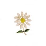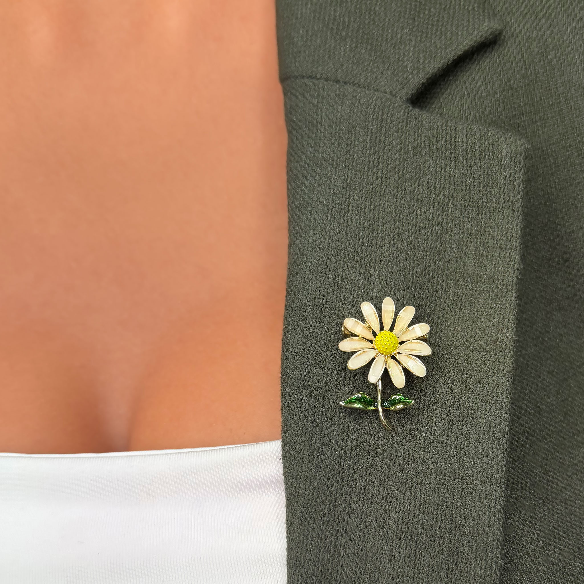 Broșa în formă de floare aurie cu petale albe aduce un omagiu frumuseții și gingășiei naturii. Contrastul elegant dintre strălucirea aurie și delicatețea petalelor albe transformă broșa într-un accesoriu rafinat, plin de prospețime și feminitate. Este alegerea ideală pentru a celebra primăvara și energia sa luminoasă.