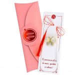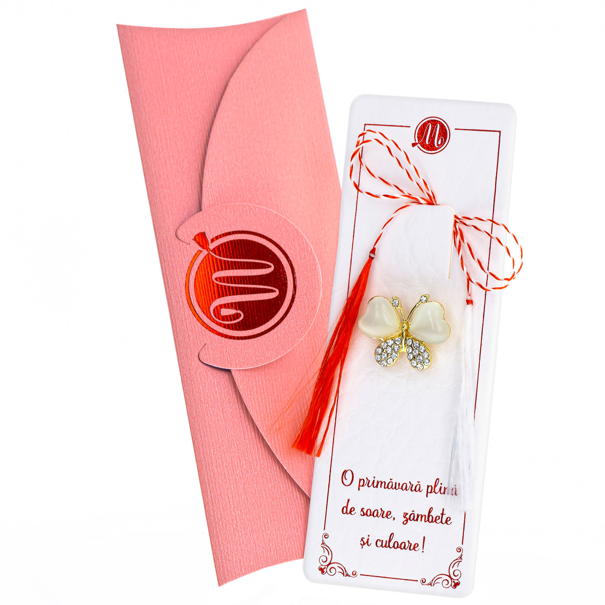 - Broșă Mărțișor Luna Fluturaș cu Pietricele, șnur Marțișor alb-roșu, însoțită de suport pentru broșă, plic roz, pregătită cu grijă pentru a fi oferită ca un cadou special, simbol al tradiției.