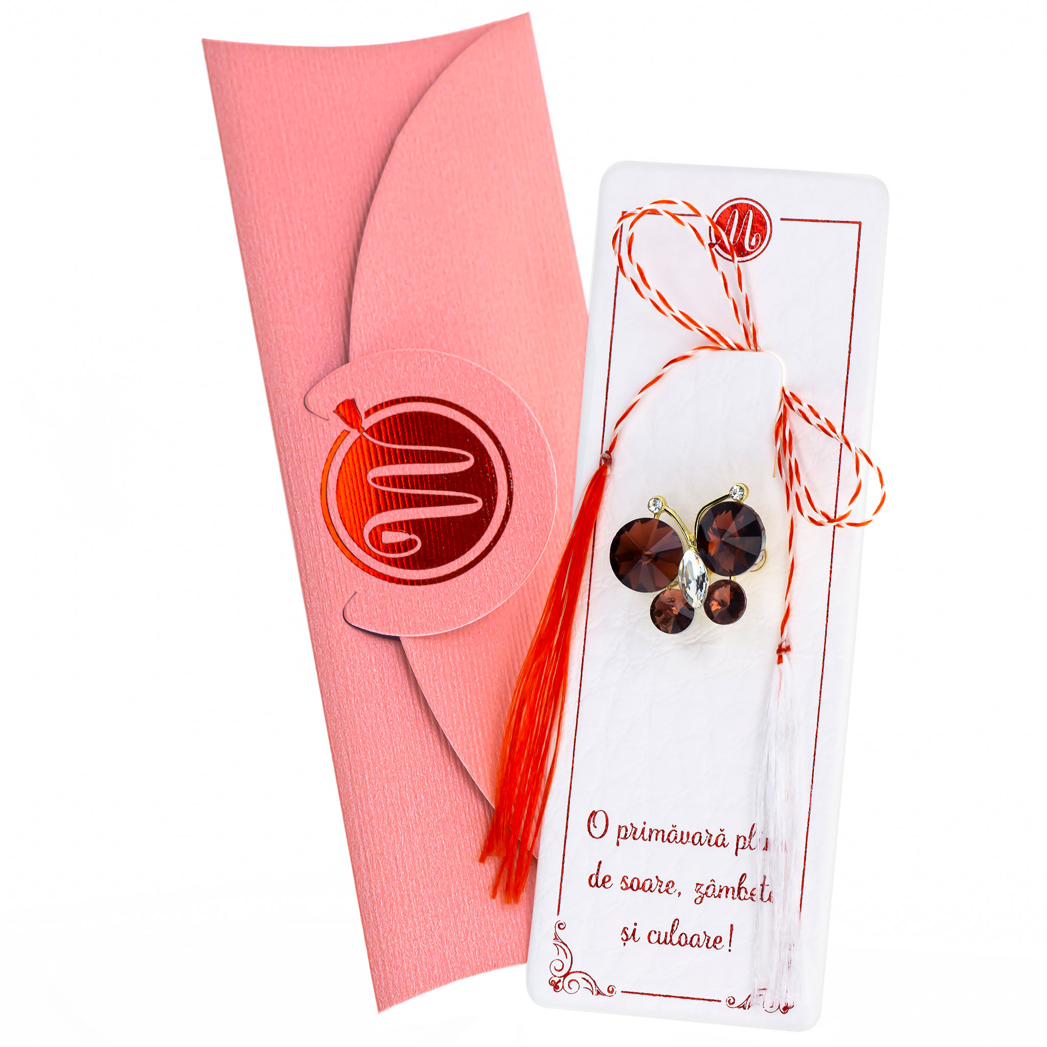 - Broșă Mărțișor Luna Fluture, șnur Marțișor alb-roșu, însoțită de suport pentru broșă, plic roz, pregătită cu grijă pentru a fi oferită ca un cadou special, simbol al tradiției.