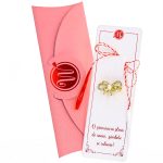 - Broșă Mărțișor Luna Fundiță Aurie cu Perluță, șnur Marțișor alb-roșu, însoțită de suport pentru broșă, plic roz, pregătită cu grijă pentru a fi oferită ca un cadou special, simbol al tradiției.