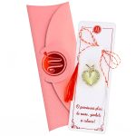 - Broșă Mărțișor Luna Inimă Stilizată, șnur Marțișor alb-roșu, însoțită de suport pentru broșă, plic roz, pregătită cu grijă pentru a fi oferită ca un cadou special, simbol al tradiției.