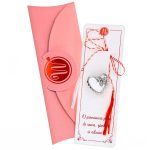 - Broșă Mărțișor Luna Inimioară Argintie cu Fluturaș, șnur Marțișor alb-roșu, însoțită de suport pentru broșă, plic roz, pregătită cu grijă pentru a fi oferită ca un cadou special, simbol al tradiției.