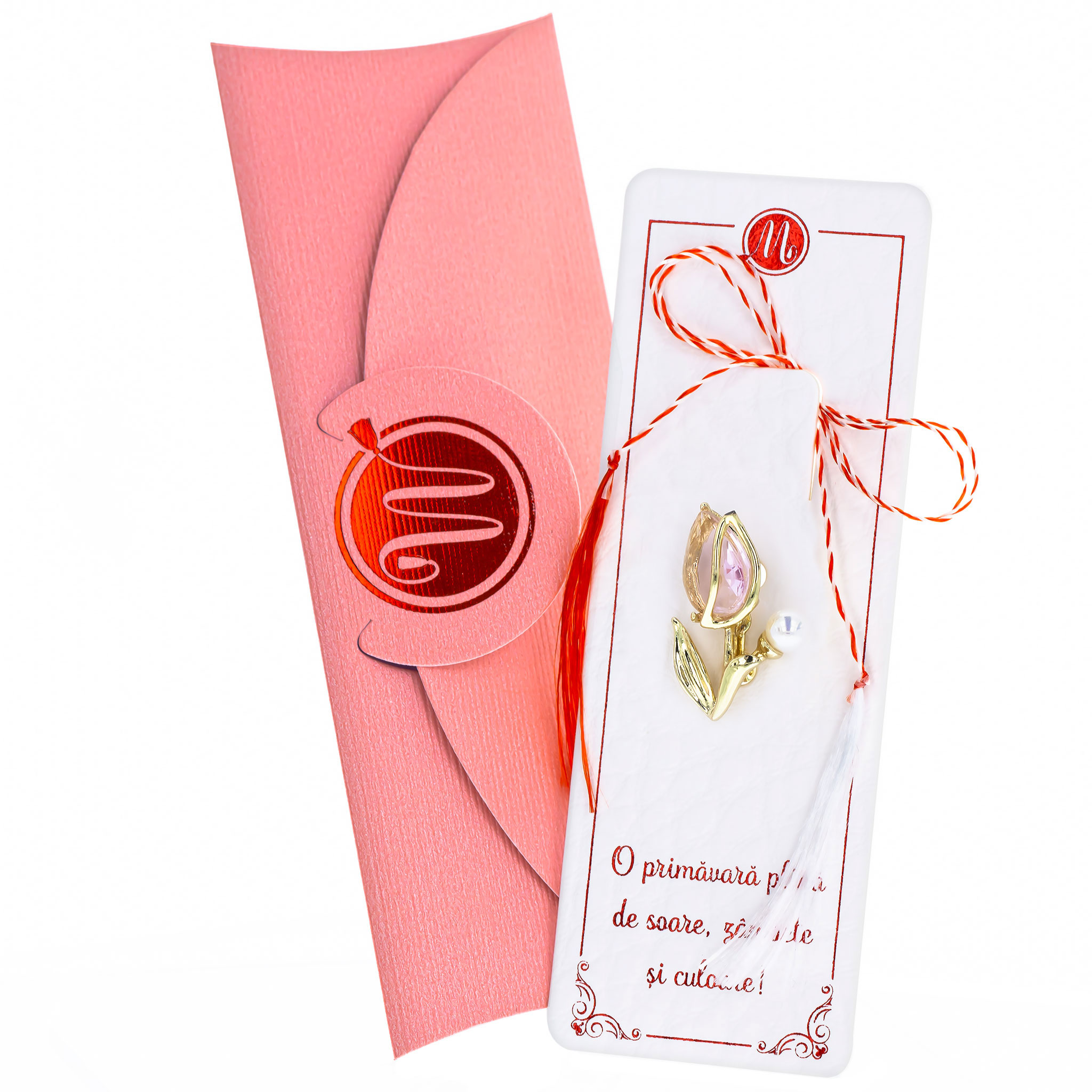 - Broșă Mărțișor Luna Lalea Roz, șnur Marțișor alb-roșu, însoțită de suport pentru broșă, plic roz, pregătită cu grijă pentru a fi oferită ca un cadou special, simbol al tradiției.