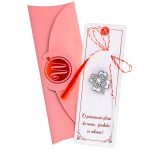 - Broșă Mărțișor Luna Trifoi Argintiu cu Petale Albe, șnur Marțișor alb-roșu, însoțită de suport pentru broșă, plic roz, pregătită cu grijă pentru a fi oferită ca un cadou special, simbol al tradiției.