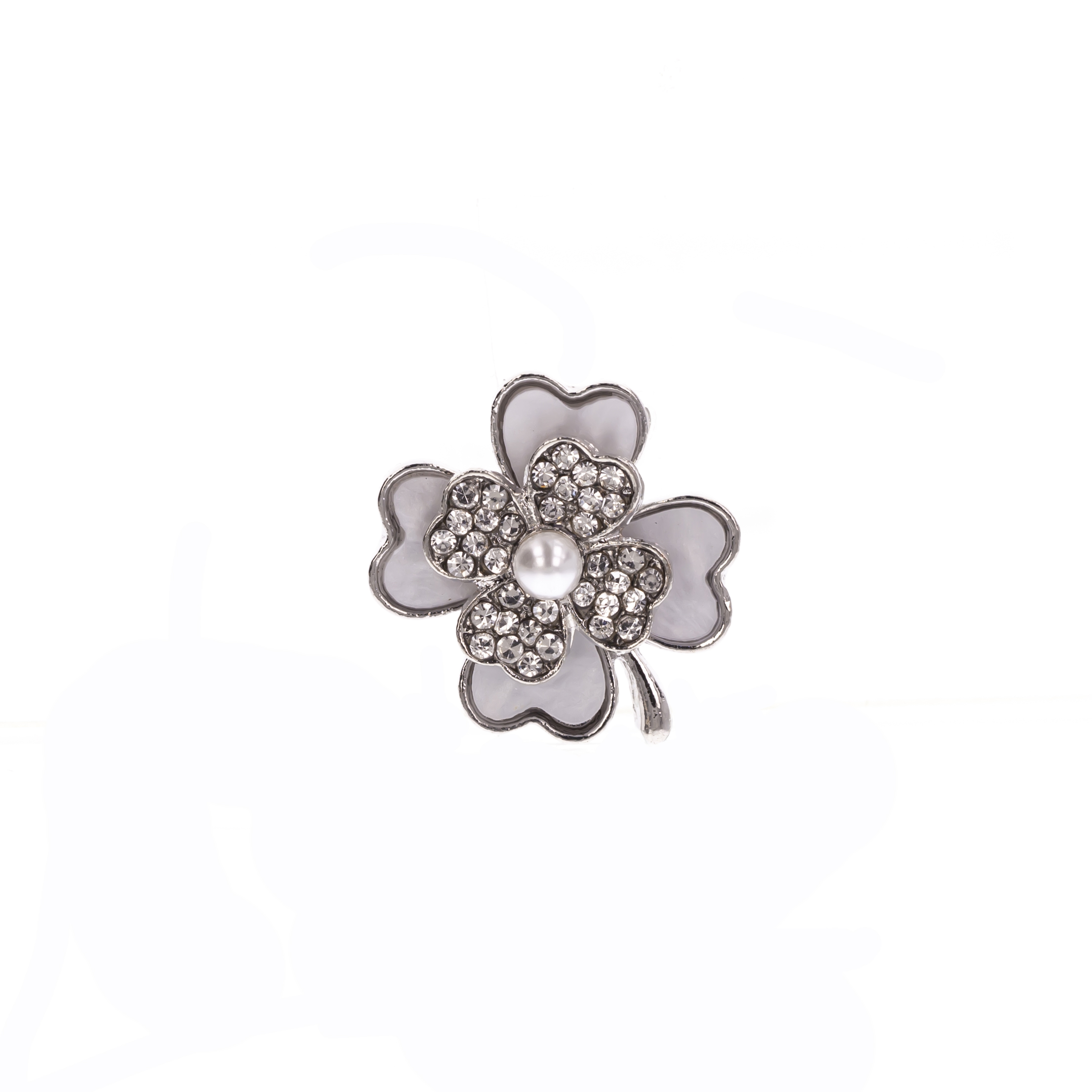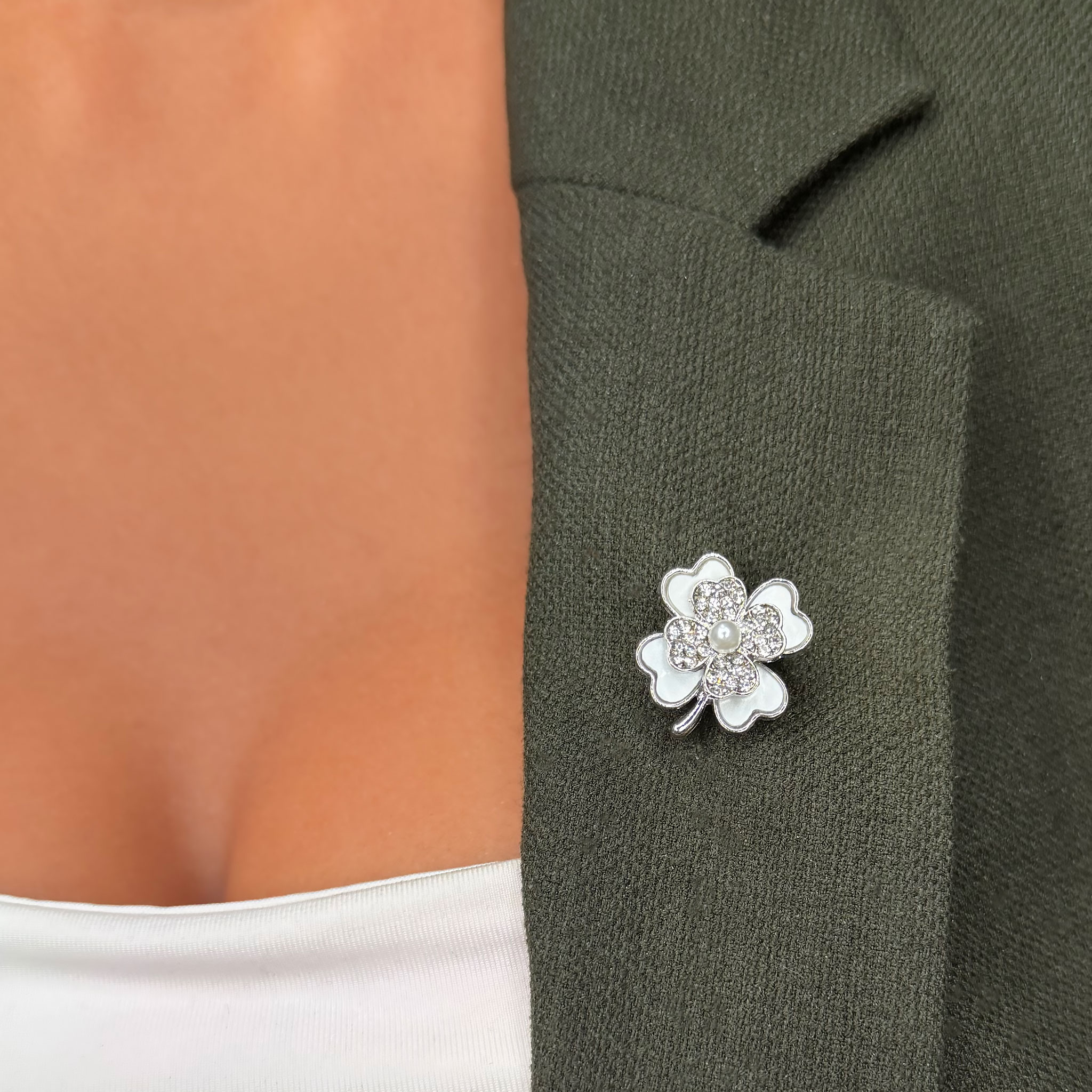 Broșă Luna Trifoi Argintiu cu Petale Albe