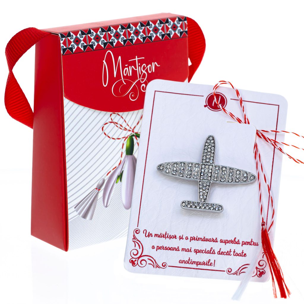 - Broșă Mărțișor Gentuță Avion Argintiu cu Pietre Strălucitoare, șnur Marțișor alb-roșu, ambalată în cutie tip gentuță, pregătită cu grijă pentru a fi oferită ca un cadou special, simbol al tradiției.