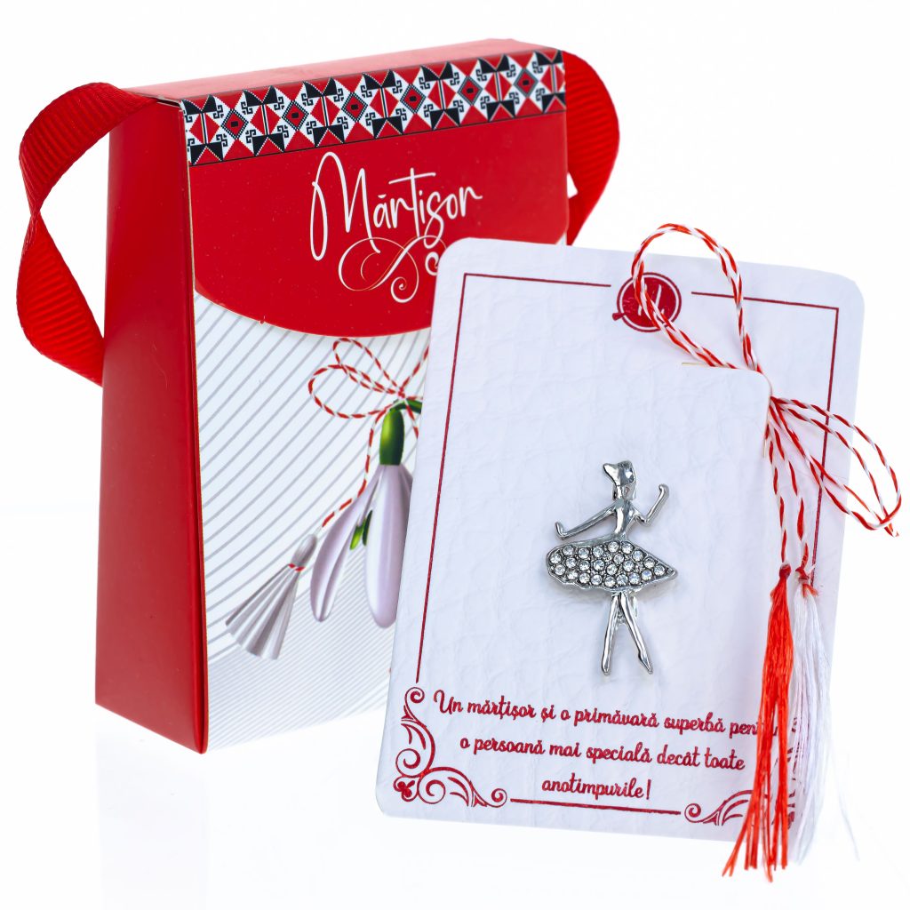 - Broșă Mărțișor Gentuță Balerină Argintie, șnur Marțișor alb-roșu, ambalată în cutie tip gentuță, pregătită cu grijă pentru a fi oferită ca un cadou special, simbol al tradiției.