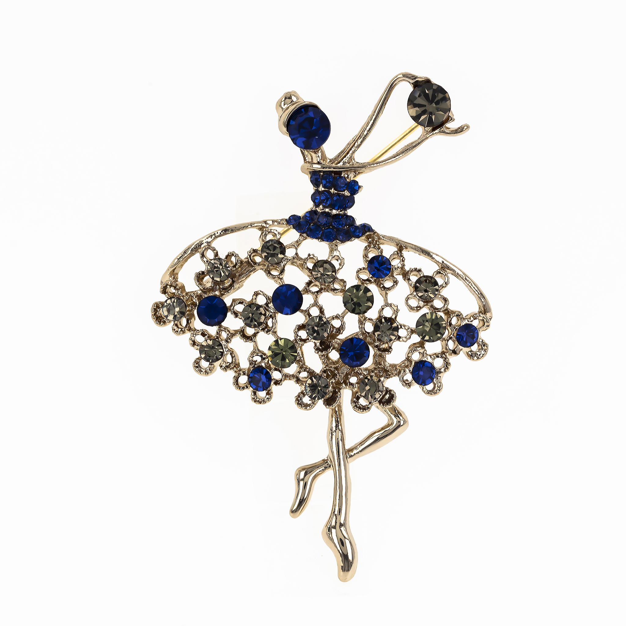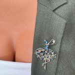 - Design: Broșa are forma unei balerine elegante, al cărei tutu este împodobit cu pietricele albastre strălucitoare. Albastrul conferă un aer sofisticat și calm, completând perfect delicatețea siluetei.