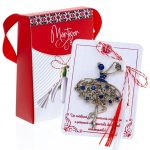 - Broșă Mărțișor Gentuță Balerină cu Pietricele Albastre, șnur Marțișor alb-roșu, ambalată în cutie tip gentuță, pregătită cu grijă pentru a fi oferită drept simbol al tradiției și al frumuseții primăverii.
