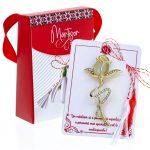 - Broșă Mărțișor Gentuță Boboc de Trandafir Auriu, șnur Marțișor alb-roșu, ambalată în cutie tip gentuță, pregătită cu grijă pentru a fi oferită ca un cadou special, simbol al tradiției.