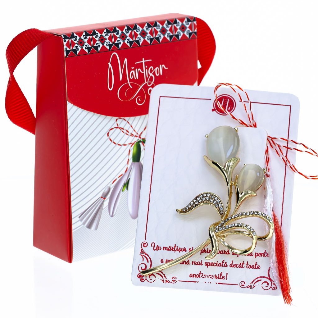 - Broșă Mărțișor Gentuță Boboci de Floare cu Fundiță Aurie, șnur Marțișor alb-roșu, ambalată în cutie tip gentuță, pregătită cu grijă pentru a fi oferită ca un cadou special, simbol al tradiției.