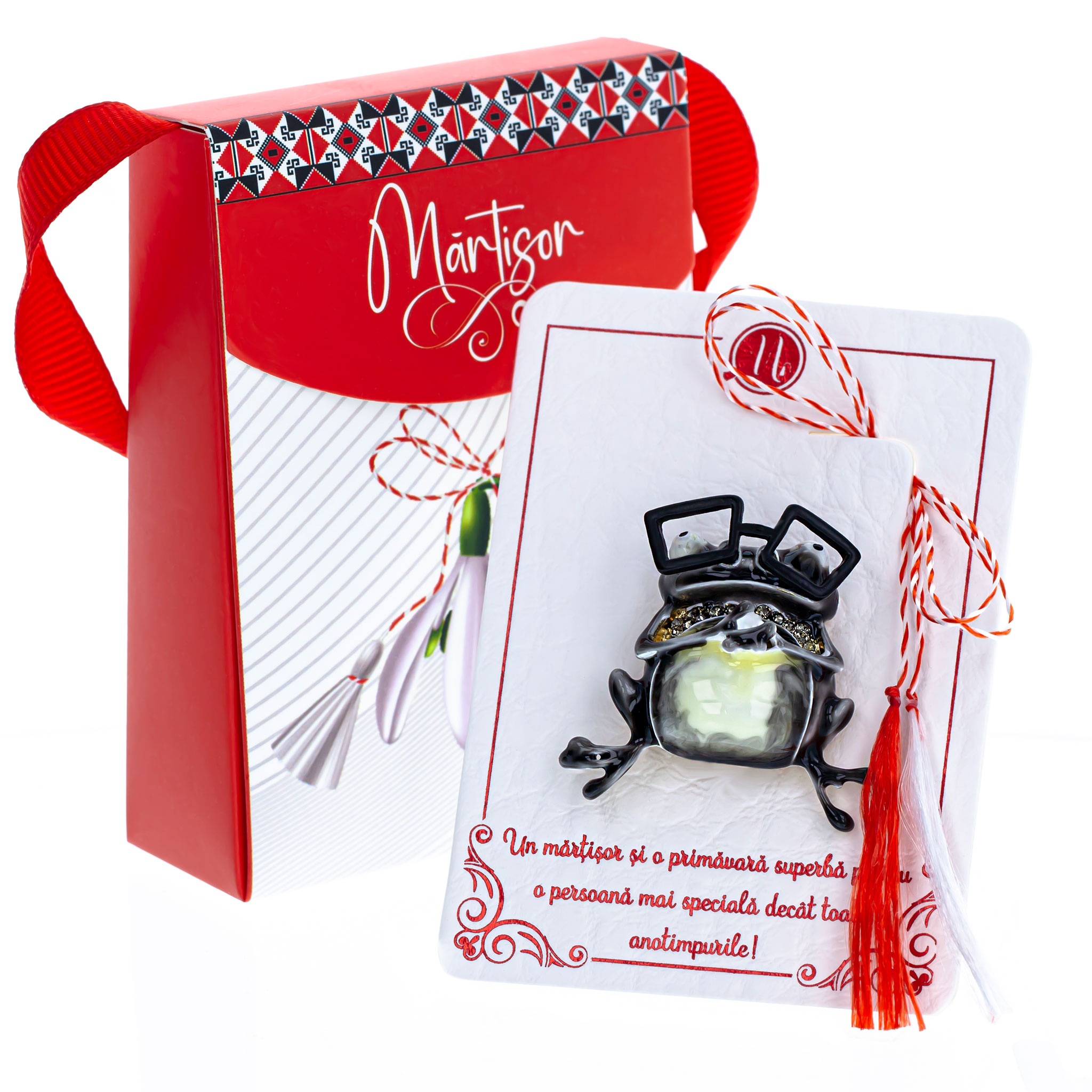 - Broșă Mărțișor Gentuță Broscuță Gânditoare Gri, șnur Marțișor alb-roșu, ambalată în cutie tip gentuță, pregătită cu grijă pentru a fi oferită drept simbol al tradiției și al frumuseții primăverii.