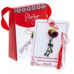 - Broșă Mărțișor Gentuță Broscuță Gri cu Baloane, șnur Marțișor alb-roșu, ambalată în cutie tip gentuță, pregătită cu grijă pentru a fi oferită drept simbol al tradiției și al frumuseții primăverii.