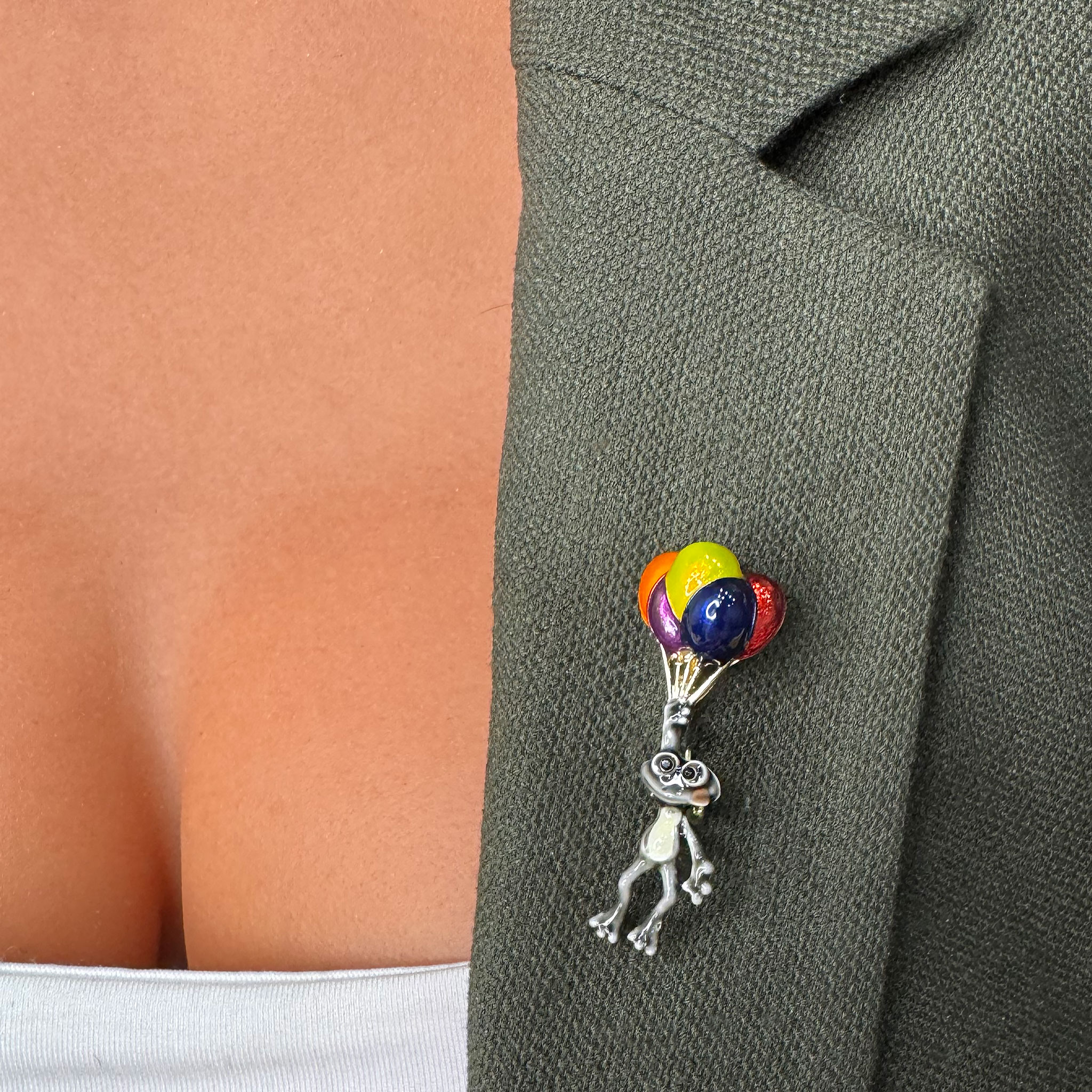 - Design: Această broșă impresionează prin linii subtile și culori delicate. Simplitatea formei broscuței și baloanelor adaugă un plus de eleganță și farmec întregului design. Nuanța discretă de gri aduce un aer rafinat bijuteriei, iar dimensiunile moderate fac ca această broșă să fie ușor de integrat în diverse ținute.