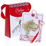 - Broșă Mărțișor Gentuță Buchet Auriu cu Floricele, șnur Marțișor alb-roșu, ambalată în cutie tip gentuță, pregătită cu grijă pentru a fi oferită ca un cadou special, simbol al tradiției.