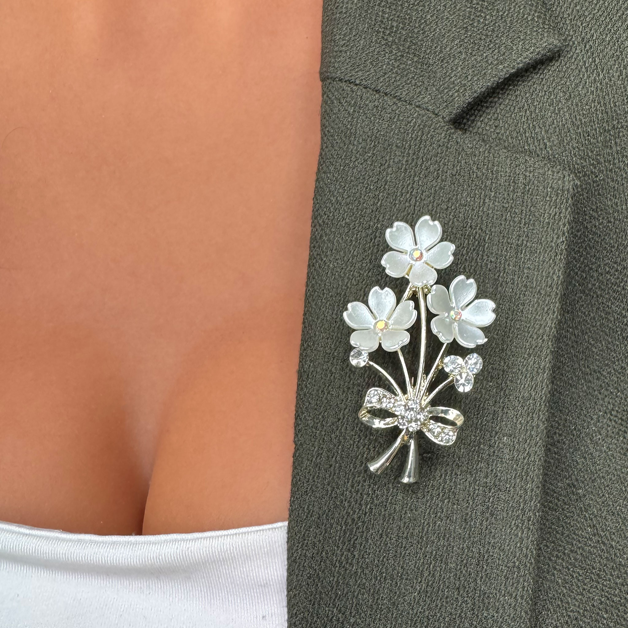 Această broșă emană eleganță, potrivită pentru a evidenția frumusețea și feminitatea într-un mod subtil și rafinat. Cu designul său în formă de buchețel cu flori albe și strălucirea pietrelor, transmite un aer sofisticat și clasic, fiind potrivită pentru ocazii speciale sau pentru a sublinia eleganța unei ținute.