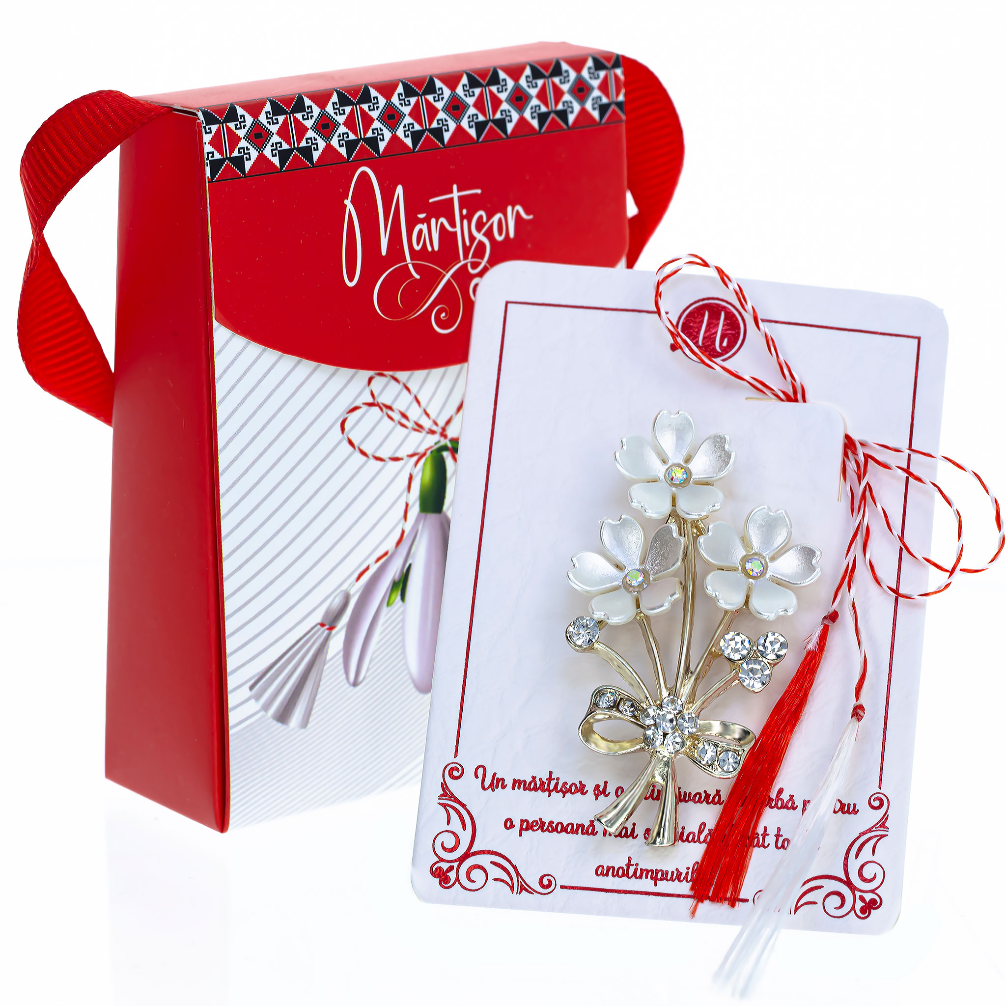 - Broșă Mărțișor Gentuță Buchețel cu Flori Albe, șnur Marțișor alb-roșu, ambalată în cutie tip gentuță, pregătită cu grijă pentru a fi oferită ca un cadou special, simbol al tradiției.