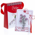 - Broșă Mărțișor Gentuță Buchețel cu Inimioare, șnur Marțișor alb-roșu, ambalată în cutie tip gentuță, pregătită cu grijă pentru a fi oferită drept simbol al tradiției și al frumuseții primăverii.