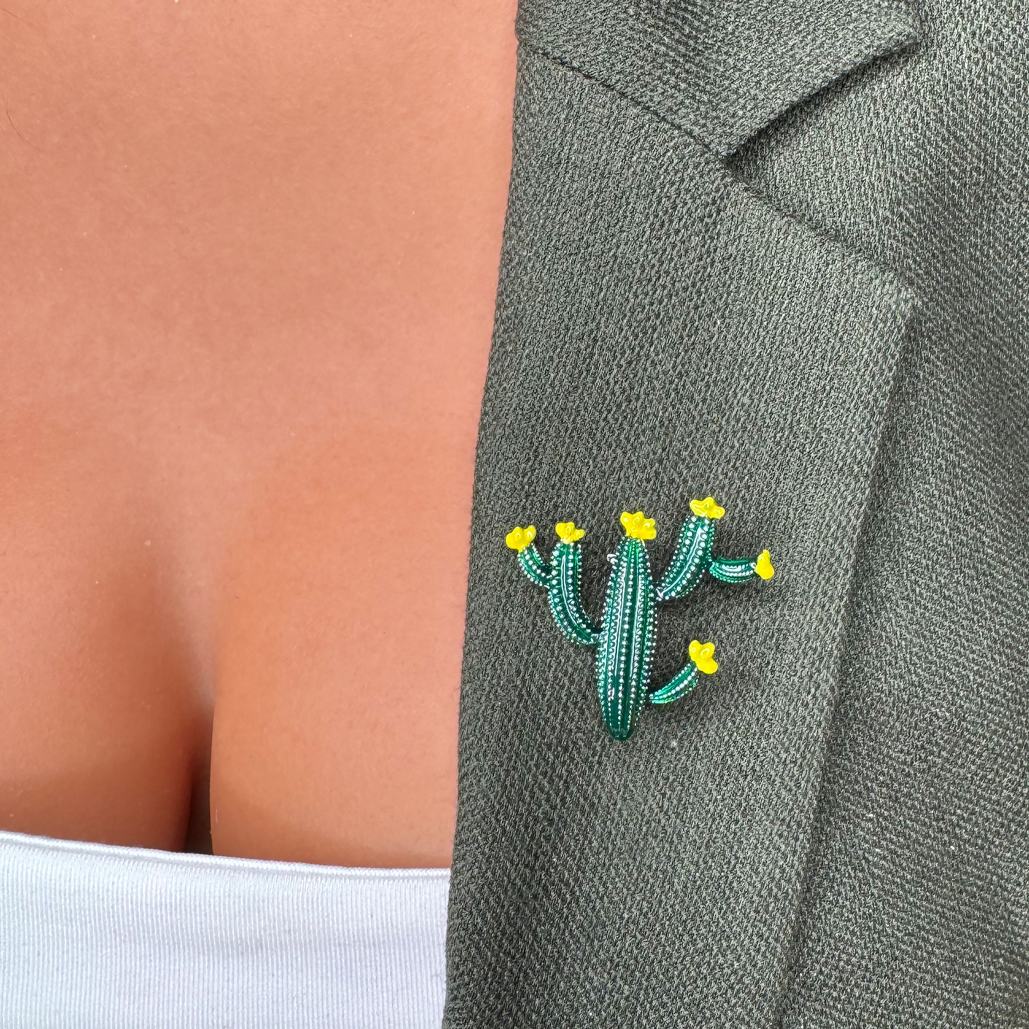 - Design: Broșa are forma unui cactus stilizat, împodobit cu flori delicate, creând un accesoriu plin de farmec și originalitate.