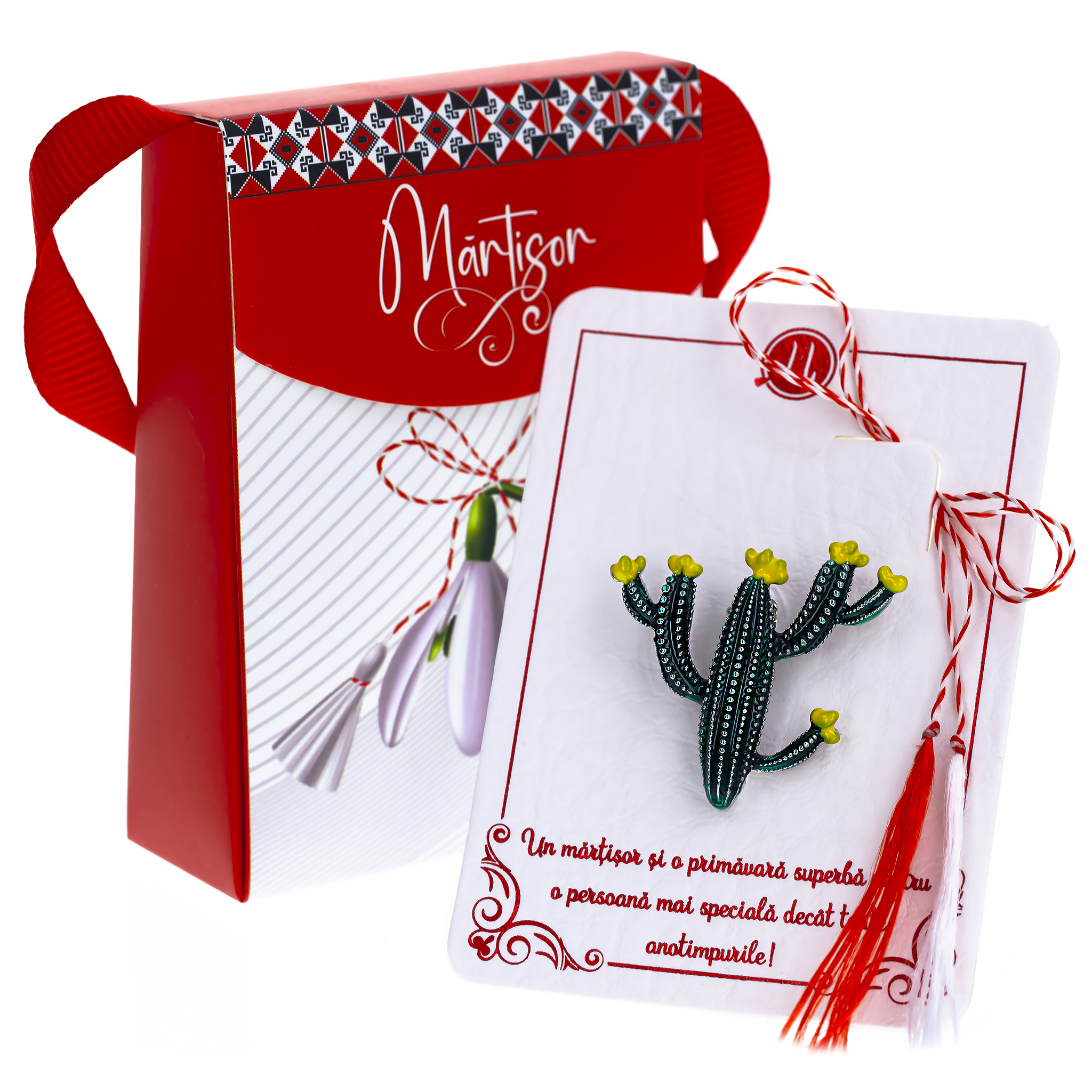 - Broșă Mărțișor Gentuță Cactus cu Flori, șnur Marțișor alb-roșu, ambalată în cutie tip gentuță, pregătită cu grijă pentru a fi oferită drept simbol al tradiției și al frumuseții primăverii.