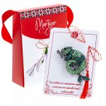 - Broșă Mărțișor Gentuță Cameleon, șnur Marțișor alb-roșu, ambalată în cutie tip gentuță, pregătită cu grijă pentru a fi oferită drept simbol al tradiției și al frumuseții primăverii.
