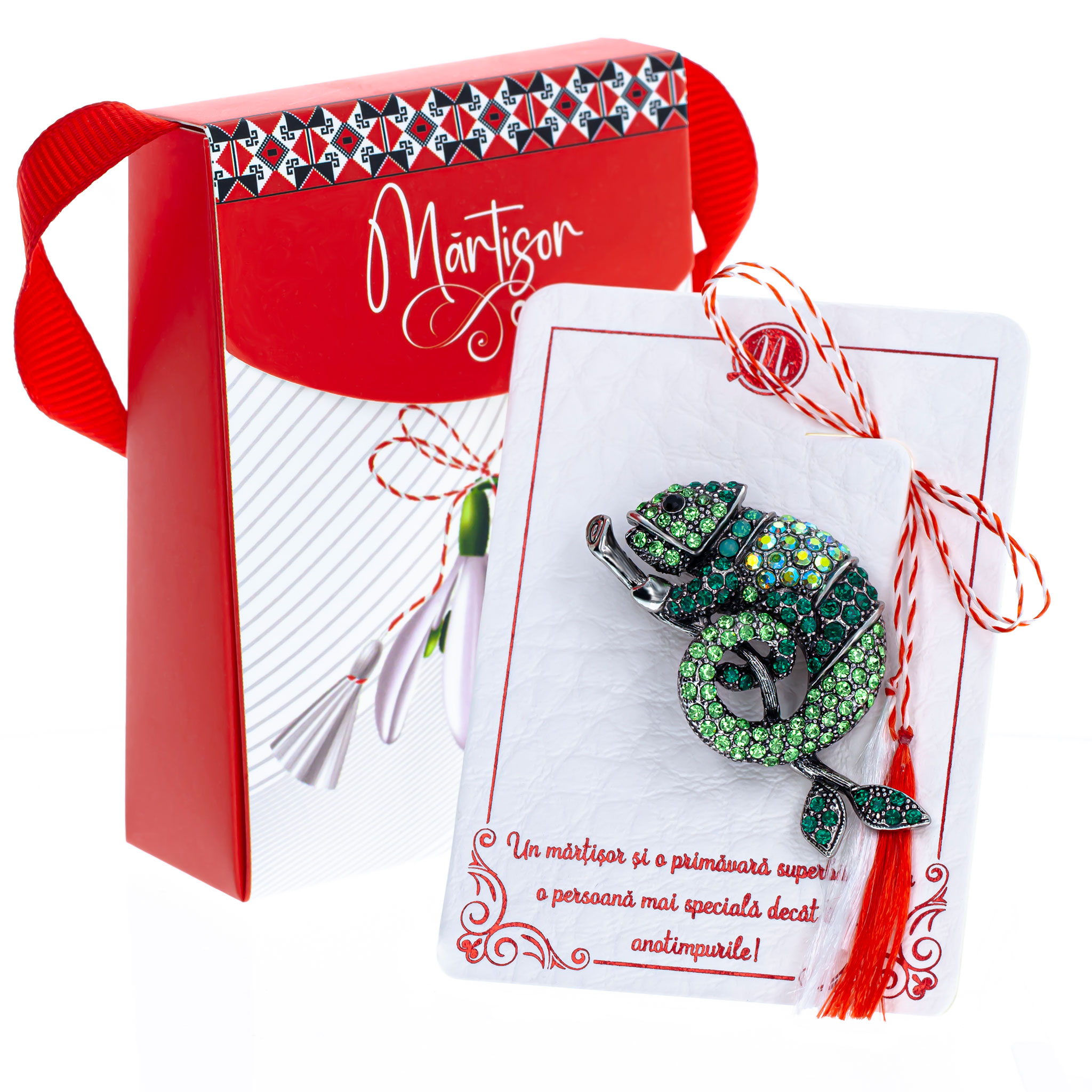 - Cameleonul este adesea asociat cu simbolurile adaptabilității și ale abilității de a se camufla în mediul înconjurător. În contextul Mărțișorului, broșa în forma de cameleon devine astfel un simbol al adaptabilității la schimbările vieții și al abordării creatoare a diversității. Culorile vibrante adaugă o notă de originalitate, sugerând un spirit liber și neîngrădit.
