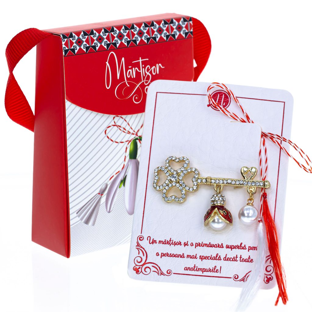 - Broșă Mărțișor Gentuță Cheiță Aurie cu Buburuză, șnur Marțișor alb-roșu, ambalată în cutie tip gentuță, pregătită cu grijă pentru a fi oferită ca un cadou special, simbol al tradiției.