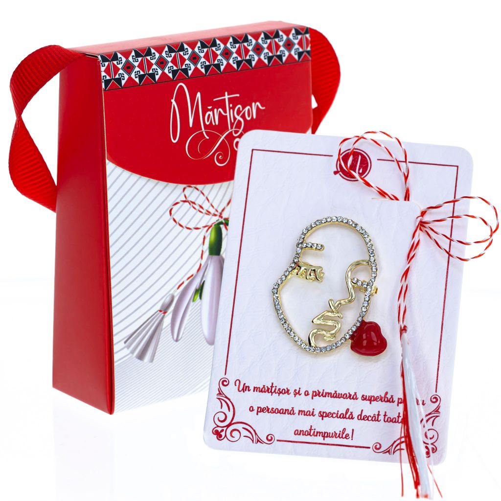 - Broșă Mărțișor Gentuță Chip Auriu cu Inimioară, șnur Marțișor alb-roșu, ambalată în cutie tip gentuță, pregătită cu grijă pentru a fi oferită ca un cadou special, simbol al tradiției.