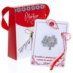 - Broșă Mărțișor Gentuță Copac Argintiu cu Flori, șnur Marțișor alb-roșu, ambalată în cutie tip gentuță, pregătită cu grijă pentru a fi oferită ca un cadou special, simbol al tradiției.