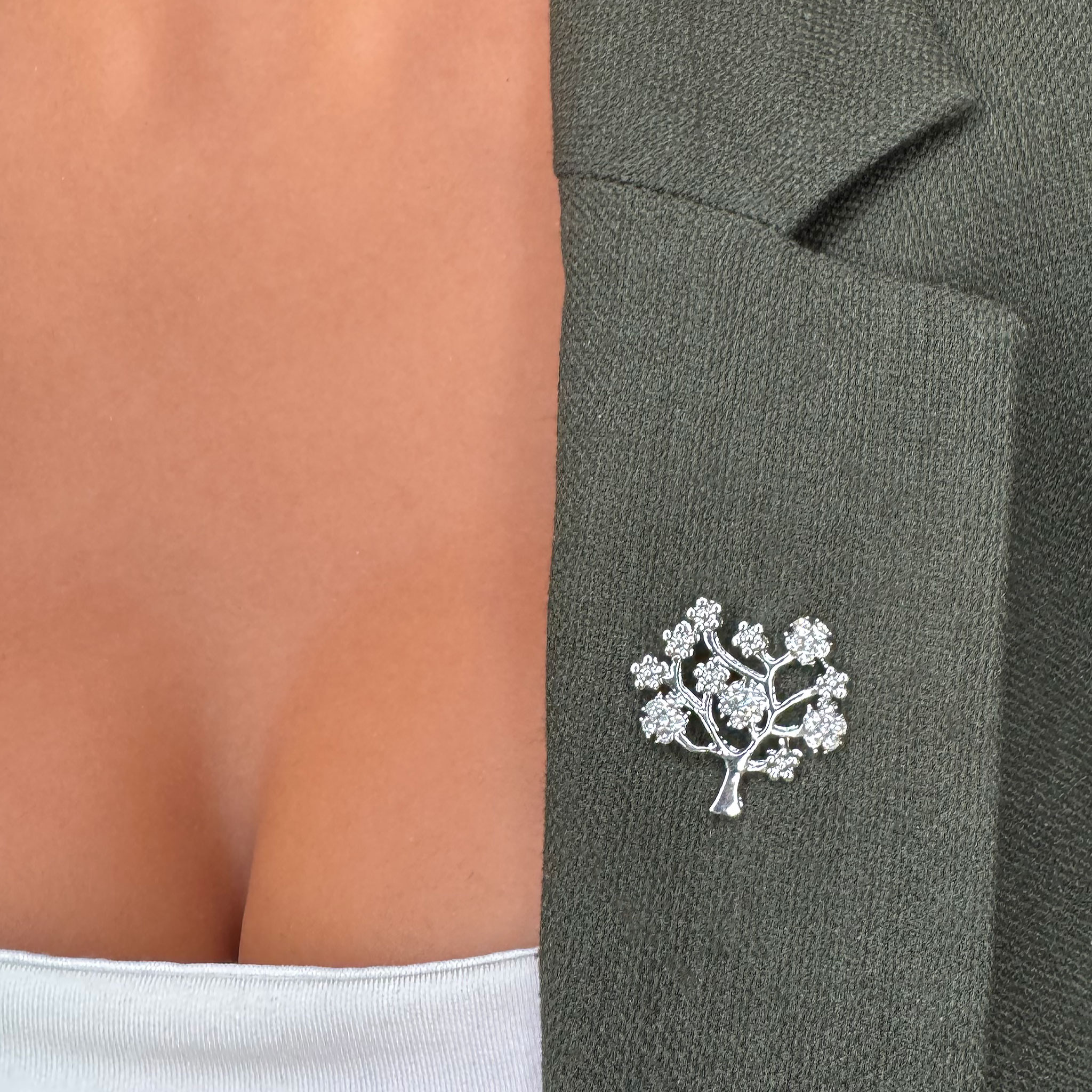 Această broșă emană o aură de rafinament și eleganță, potrivită pentru a evidenția frumusețea și feminitatea într-un mod subtil și rafinat. Cu designul său în formă de copac cu flori și strălucirea pietrelor, transmite un aer sofisticat și clasic, fiind potrivită pentru ocazii speciale sau pentru a sublinia eleganța unei ținute.