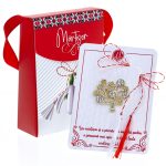 - Broșă Mărțișor Gentuță Copac Auriu cu Flori, șnur Marțișor alb-roșu, ambalată în cutie tip gentuță, pregătită cu grijă pentru a fi oferită ca un cadou special, simbol al tradiției.