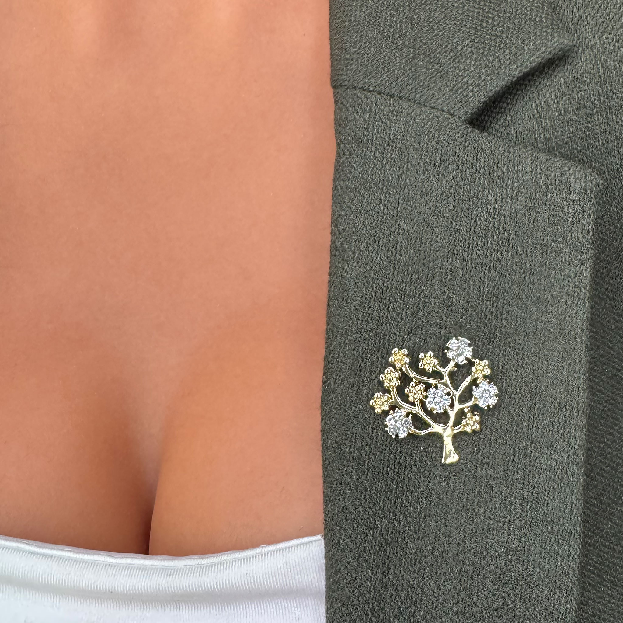 Această broșă emană o aură de rafinament și eleganță, potrivită pentru a evidenția frumusețea și feminitatea într-un mod subtil și rafinat. Cu designul său în formă de copac cu flori și strălucirea pietrelor, transmite un aer sofisticat și clasic, fiind potrivită pentru ocazii speciale sau pentru a sublinia eleganța unei ținute.