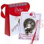 - Broșă Mărțișor Gentuță Coroniță cu fundiță și perlă, șnur Marțișor alb-roșu, ambalată în cutie tip gentuță, pregătită cu grijă pentru a fi oferită drept simbol al tradiției și al frumuseții primăverii.