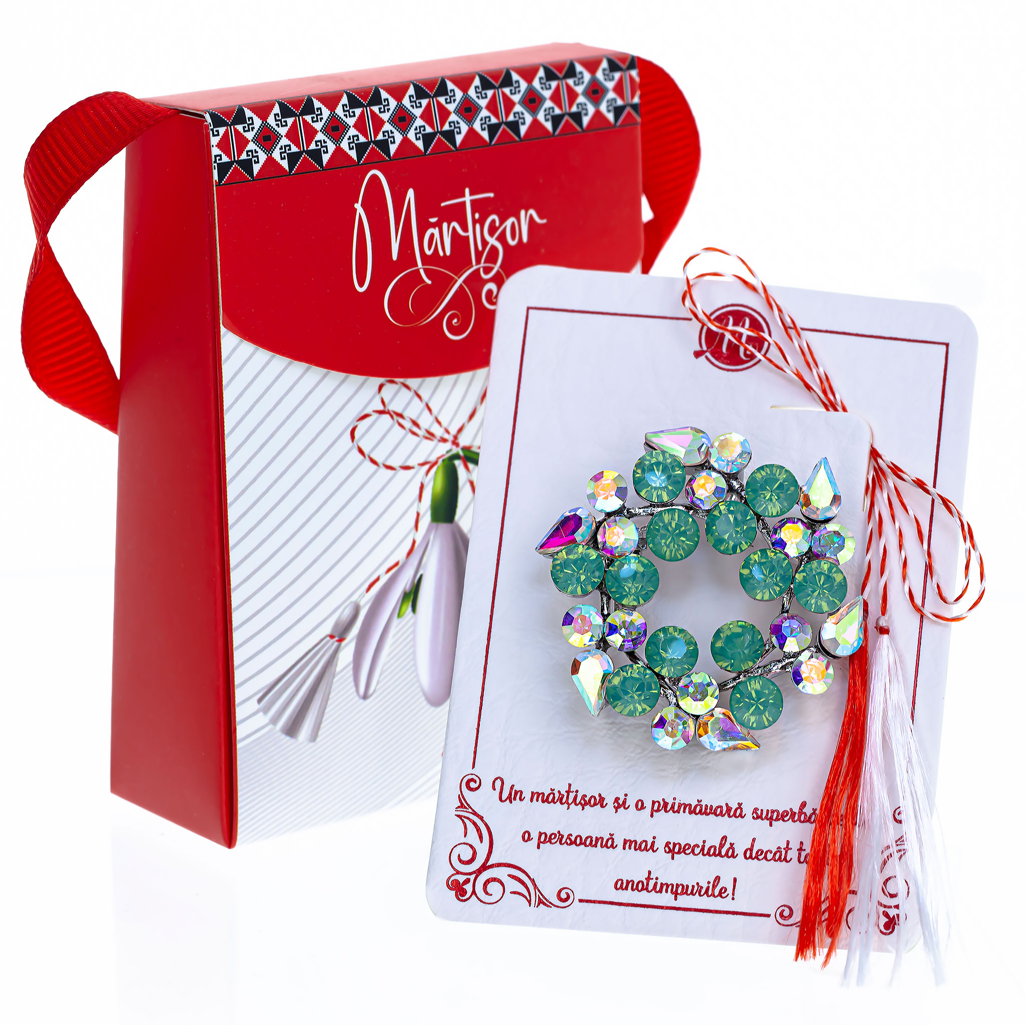 - Broșă Mărțișor Gentuță Coroniță cu Pietricele Verzi, șnur Marțișor alb-roșu, ambalată în cutie tip gentuță, pregătită cu grijă pentru a fi oferită drept simbol al tradiției și al frumuseții primăverii.