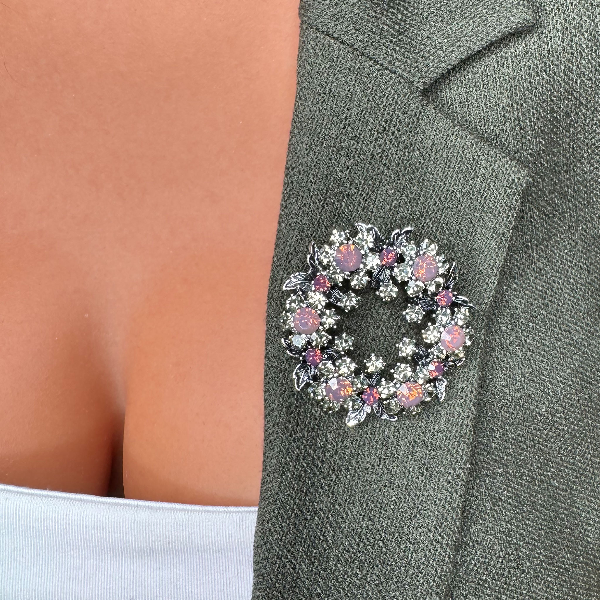 - Design: Broșa are forma unei coronițe stilizate, decorată cu pietricele roz ce strălucesc discret. Nuanța roz aduce un aer delicat și feminin, potrivit pentru un accesoriu elegant și modern.
