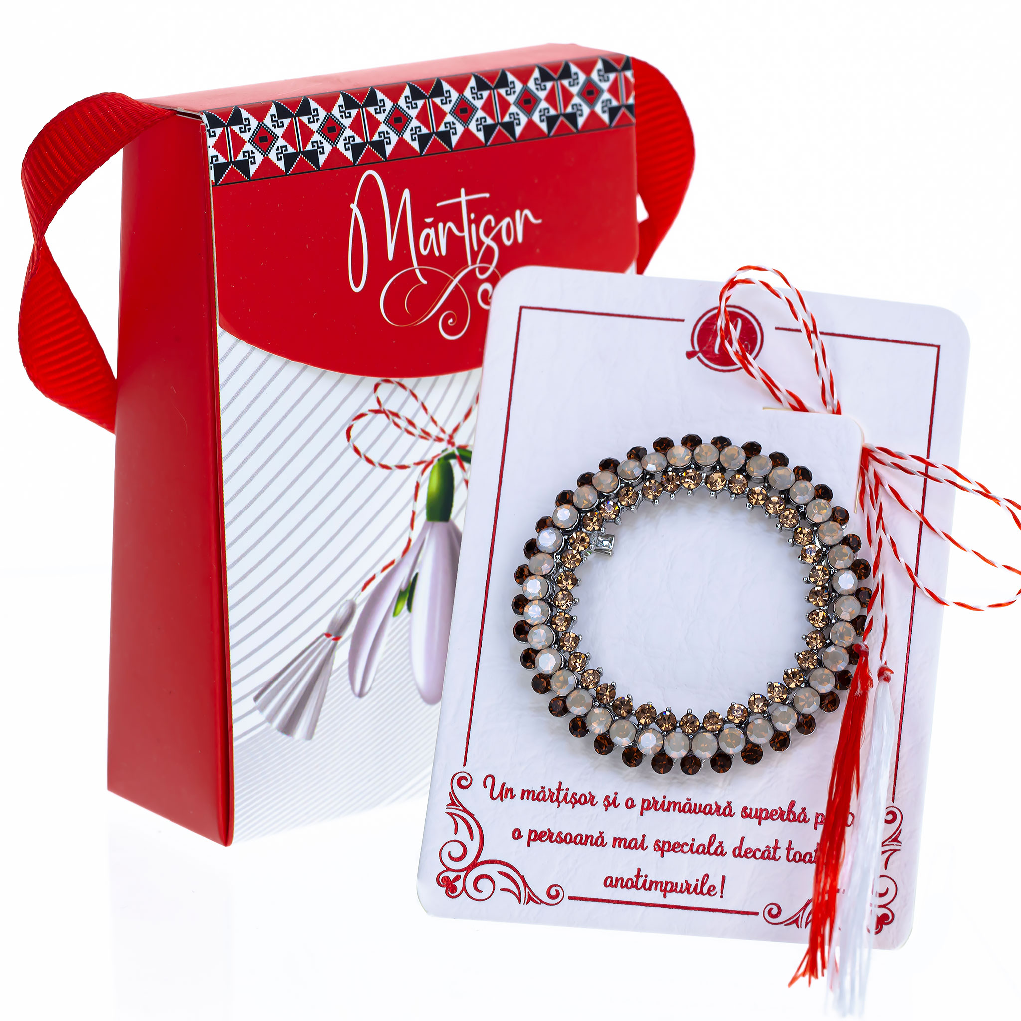 - Broșă Mărțișor Gentuță Coroniță Stilizată cu Pietre, șnur Marțișor alb-roșu, ambalată în cutie tip gentuță, pregătită cu grijă pentru a fi oferită drept simbol al tradiției și al frumuseții primăverii.