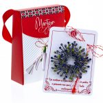 - Broșă Mărțișor Gentuță Coroniță Stilizată cu Pietricele Multicolore, șnur Marțișor alb-roșu, ambalată în cutie tip gentuță, pregătită cu grijă pentru a fi oferită drept simbol al tradiției și al frumuseții primăverii.
