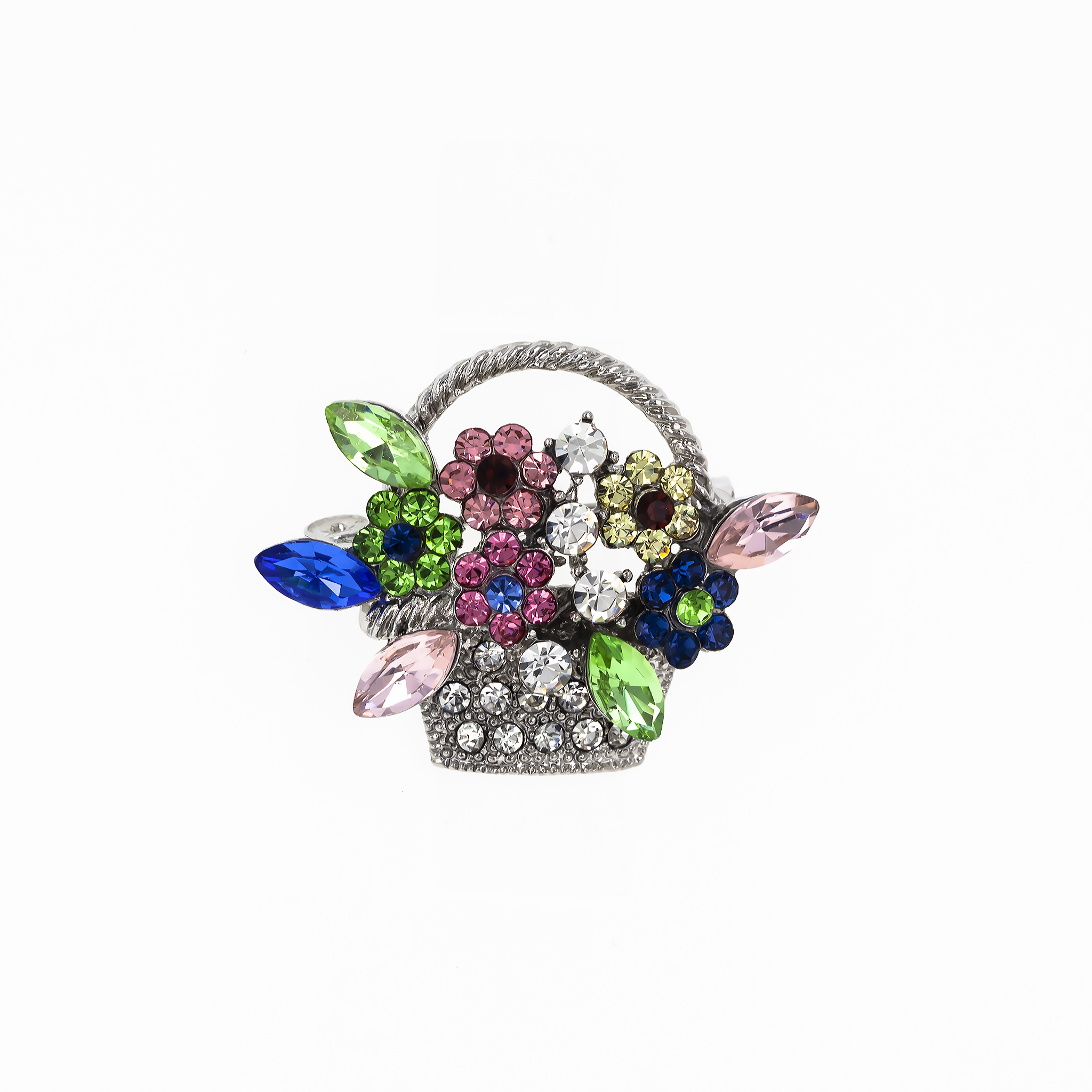 - Design: Broșa are forma unui coșuleț argintiu, delicat lucrat, din care răsar floricele colorate ce simbolizează prospețimea și frumusețea primăverii. Contrastul dintre finisajul argintiu și floricele oferă bijuteriei un aer armonios.