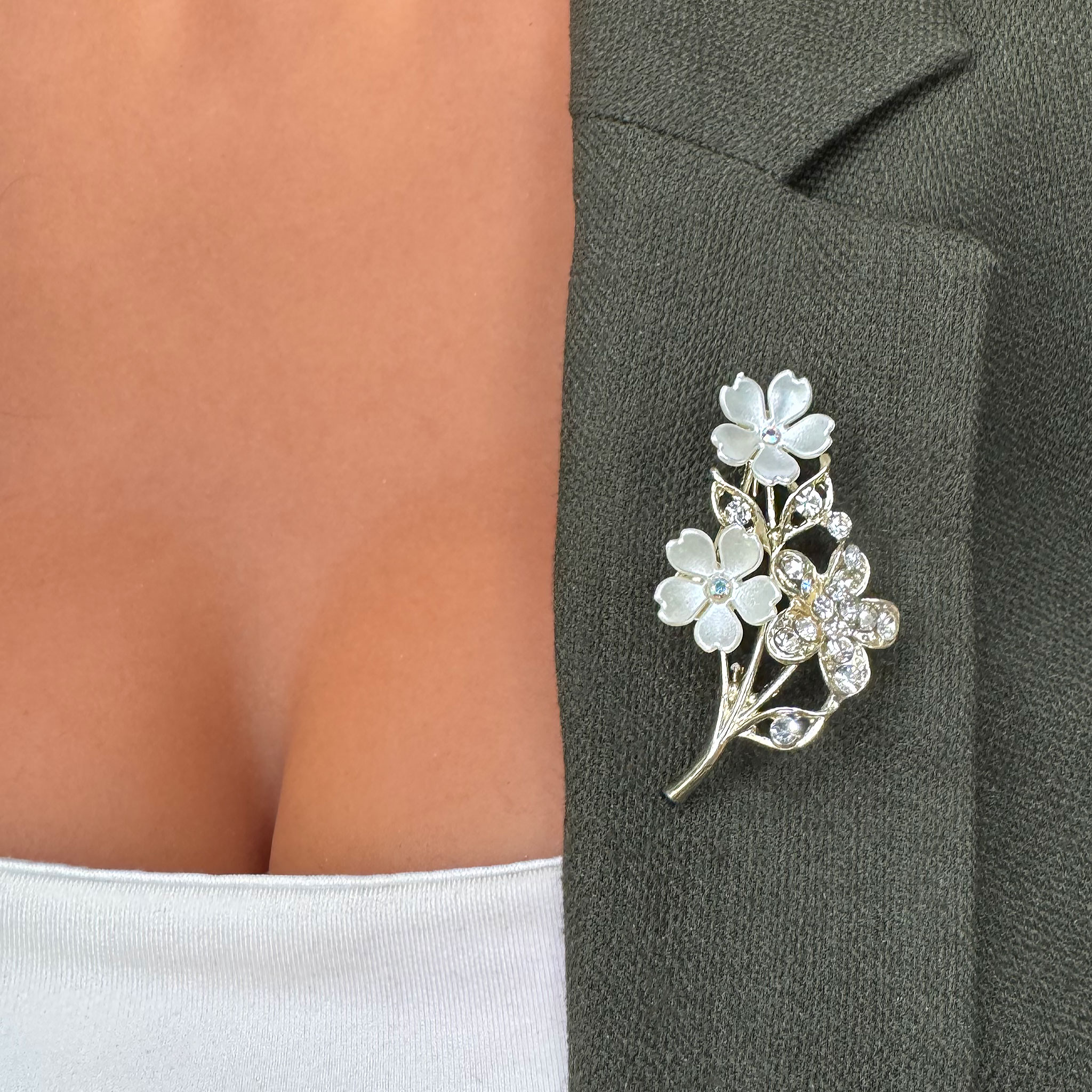 - Design: Broșa impresionează prin contururile grațioase ale ramurii și prin floricelele delicate plasate pe ea. Detaliile subtile ale petalelor și ale frunzelor adaugă un plus de farmec întregii bijuterii.