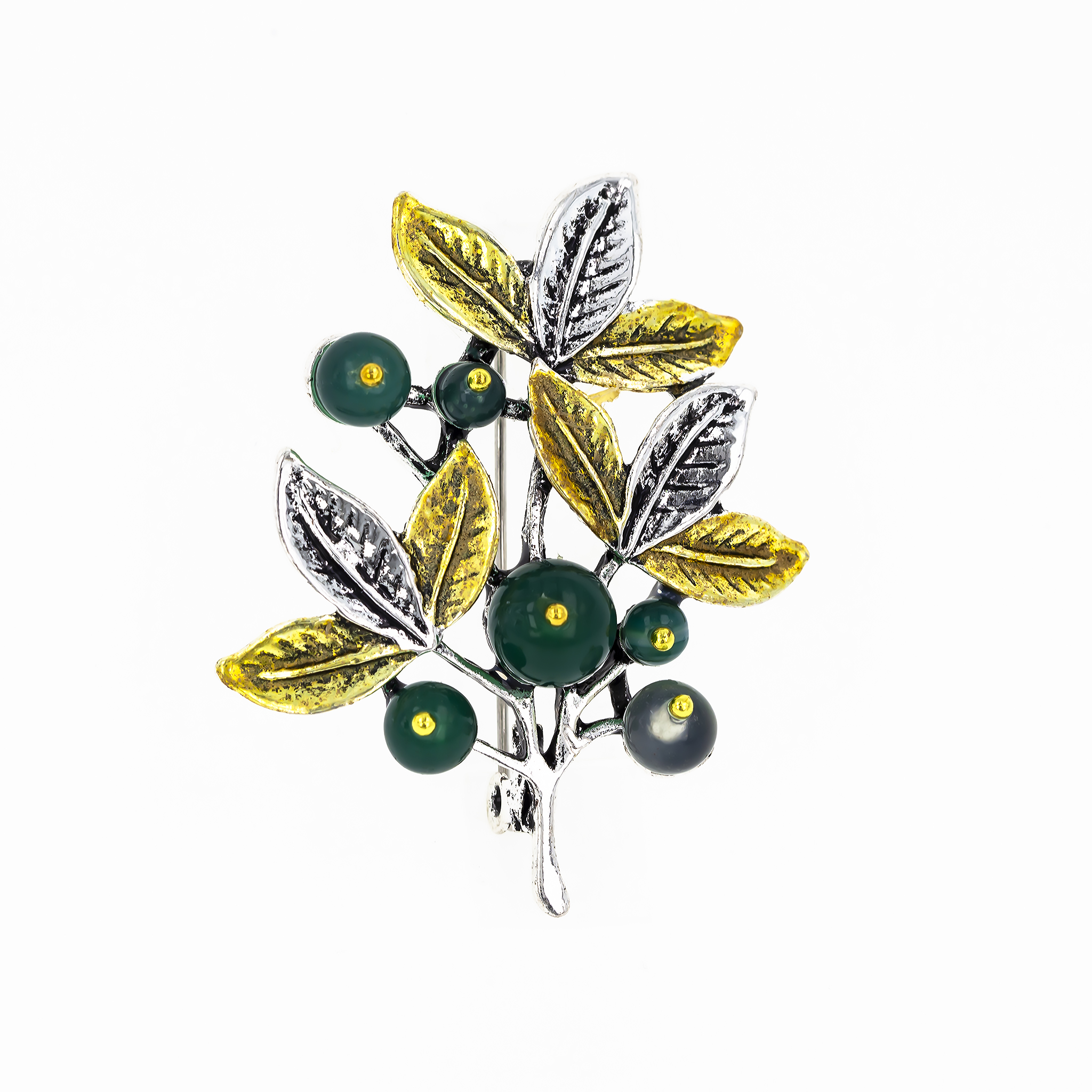- Crenguța cu frunze simbolizează renașterea, creșterea și armonia, iar perluțele verzi aduc un plus de speranță, vitalitate și echilibru. Împreună, ele transformă broșa într-un talisman al primăverii.