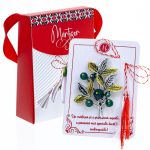 - Broșă Mărțișor Gentuță Crenguță cu Frunze și Perluțe Verzi, șnur Marțișor alb-roșu, ambalată în cutie tip gentuță, pregătită cu grijă pentru a fi oferită drept simbol al tradiției și al frumuseții primăverii.
