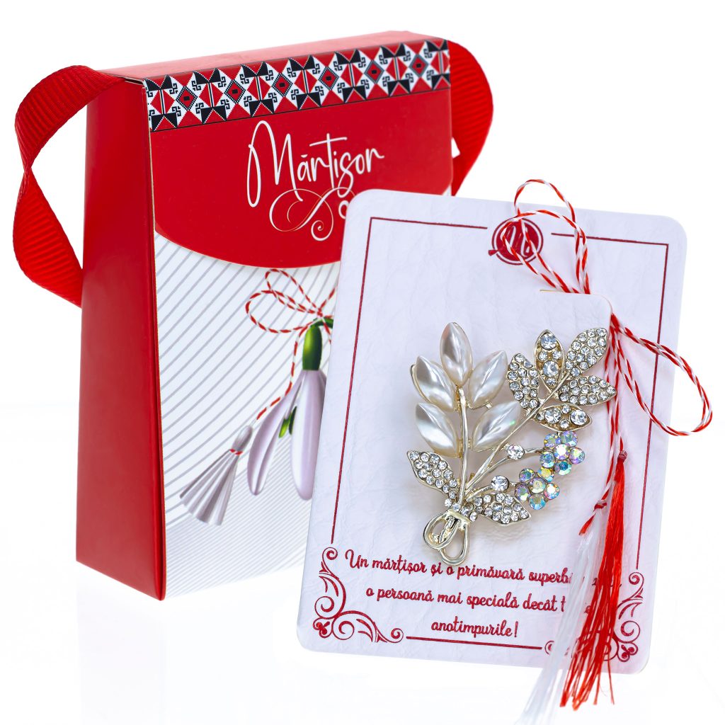 - Broșă Mărțișor Gentuță Crenguță cu Perle și Pietre, șnur Marțișor alb-roșu, ambalată în cutie tip gentuță, pregătită cu grijă pentru a fi oferită ca un cadou special, simbol al tradiției.