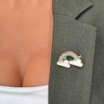 - Design: Broșa Mărțișor în formă de curcubeu cu norișori emană farmec și optimism. Forma stilizată a curcubeului și prezența norișorilor adaugă un aer de bucurie și poveste, transformând această bijuterie într-un simbol al speranței și al zilelor senine.
