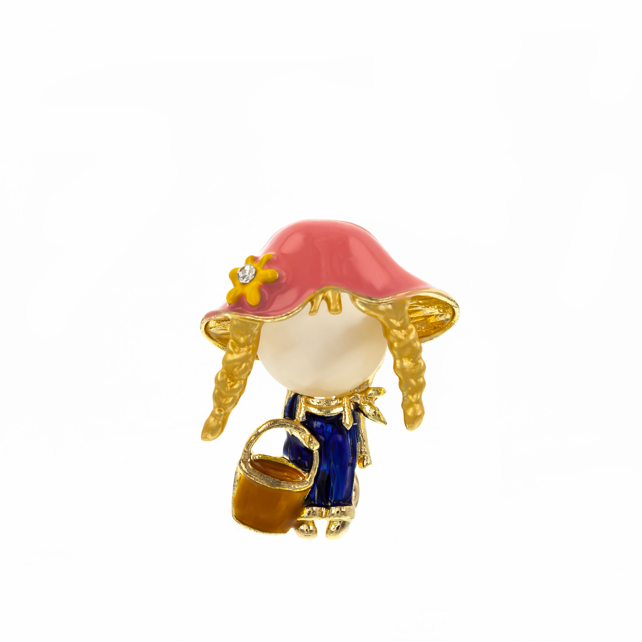 - Design: Această broșă impresionează prin simplitate și grație. Forma delicată a fetiței și bluza în nuanța de albastru adaugă un plus de eleganță și seninătate întregii bijuterii.