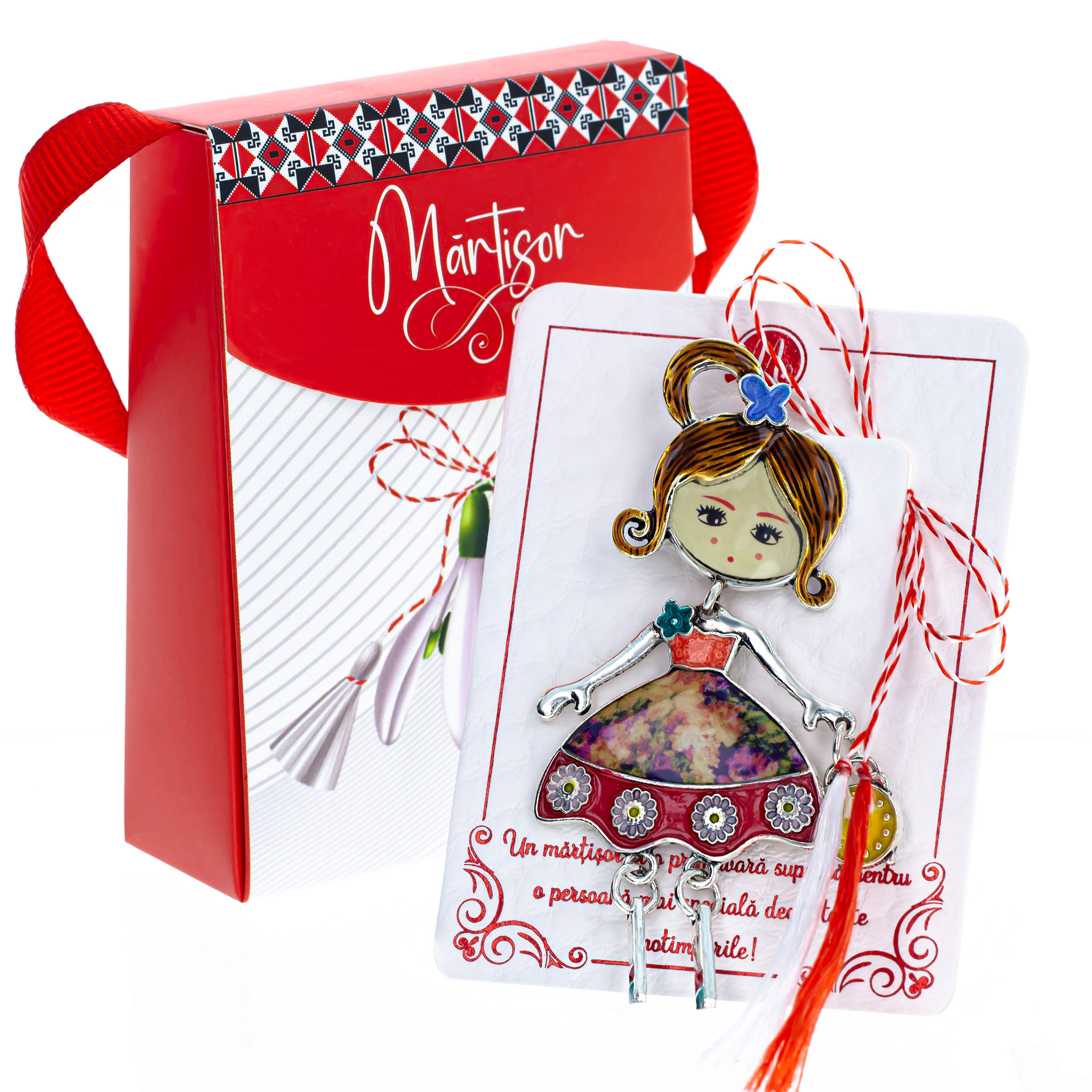 - Broșă Mărțișor Gentuță Fetiță cu Floricică Albastră, șnur Marțișor alb-roșu, ambalată în cutie tip gentuță, pregătită cu grijă pentru a fi oferită drept simbol al tradiției și al frumuseții primăverii.