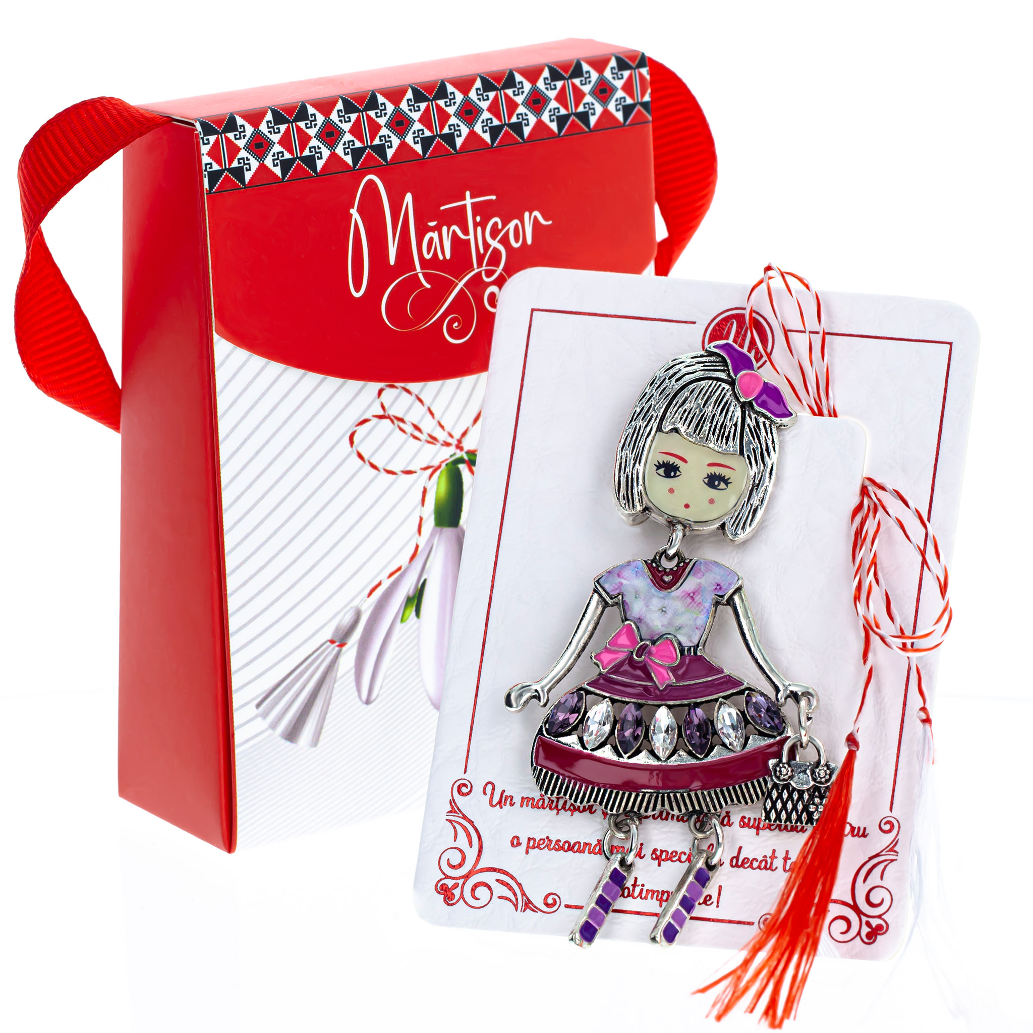 - Broșă Mărțișor Gentuță Fetiță cu Fundiță Mov, șnur Marțișor alb-roșu, ambalată în cutie tip gentuță, pregătită cu grijă pentru a fi oferită drept simbol al tradiției și al frumuseții primăverii.