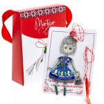 - Broșă Mărțișor Gentuță Fetiță cu Fundiță Portocalie, șnur Marțișor alb-roșu, ambalată în cutie tip gentuță, pregătită cu grijă pentru a fi oferită drept simbol al tradiției și al frumuseții primăverii.